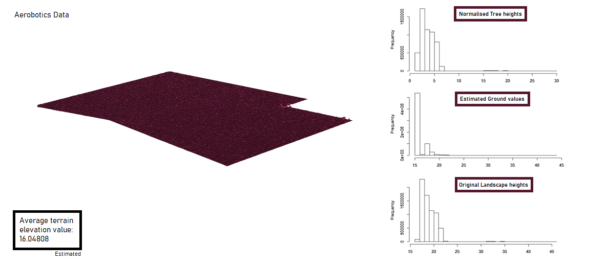 The ground estimation process is used to determine the heights of the terrain beneath tree canopies in a digital elevation model (DEM). This process involves interpolating over masked DEMs and the interpolation methods used are Contextual Void Patching (CVP) and an inverse distance weighting (IDW) method, Local Modified Shepard algorithm. The estimated terrain is subtracted from the original DEM to obtain the final output of the system: the normalised DEM — containing only above-ground heights of trees in the orchard.