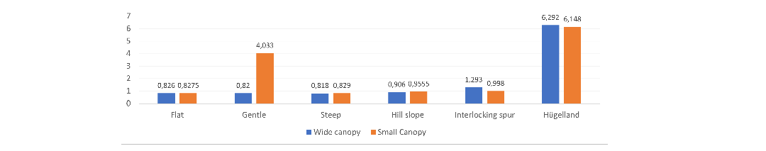 Estimation methods produced generally consistent results on different terrain types, but fared worst on hügelland DEMs. The canopy type did not affect the estimation accuracy greatly, but high magnitude error appeared to be localised about the centers of individual canopies. Noise in the DEMs contributed to error, especially in one of the DEMs of a gentle slope. Below are some results from the evaluation of the IDW (Shepard) results.