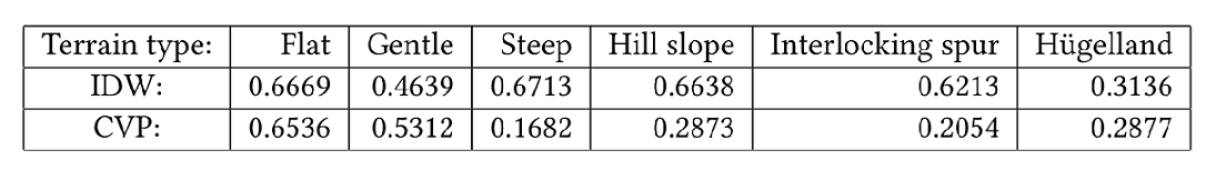 CVP was outperformed by the IDW (Shepard) interpolation method for all terrain types except the hügelland terrain [CVP RMSE ~5.9; IDW RMSE ~6.2]. However, the Kappa statistics suggest that IDW (Shepard) results for hügelland had marginally better agreement with the initial landscape.
